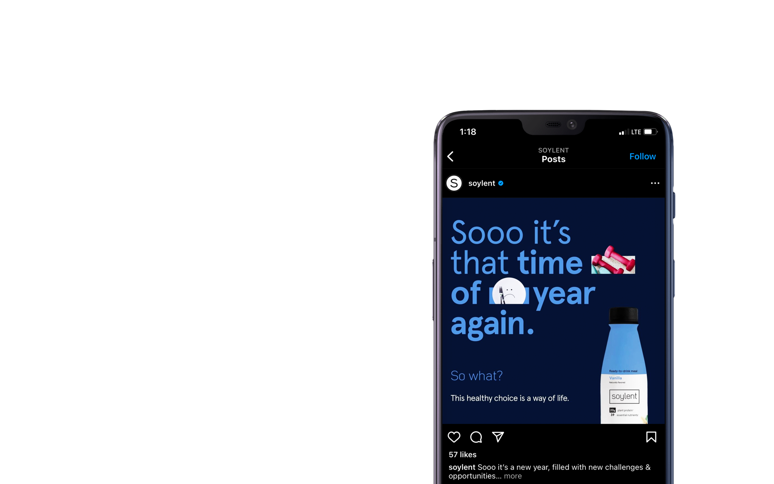 I helped develop Soylent’s Q1 2023 “So What?” campaign, designing social media assets, conceptual in-store placements, and a website header. Drawing from Soylent’s established style, I used bold typography, color blocking, and minimal imagery to create a fresh yet brand-aligned look. The campaign, which ran January–April 2023 across all channels, conveyed that while New Year’s resolutions can be challenging, staying healthy with Soylent is simple.